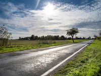 a lone highway through the countryside under a clear sky with clouds and trees, in front of a field