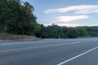 This stunning stock photo captures the break of day as the sun rises over a scenic highway. In the foreground, a man on his bike adds a sense of movement and adventure to the scene. The asphalt road stretches into the distance, surrounded by breathtaking landscapes of rolling hills and lush vegetation. The tall trees along the roadside create a picturesque setting, enhanced by the fluffy clouds in the sky. The road surface is smoothly paved, with a visible shoulder and a tar-covered slope. This captivating image showcases the beauty of rural areas and depicts a common mode of transport. Perfect for showcasing concepts related to transportation, adventure, and exploration.