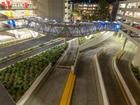 Aerial view of an elevated highway in Los Angeles at night. Street lights illuminate the residential suburb below. Traffic flows on the road while an escalator stands on the other side of the building.