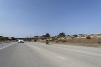 This is a stock photo of a highway road with motion blur, taken on a clear sky day. The asphalt road surface is visible, along with the lanes and the shoulder. It showcases the infrastructure of the road, with motor vehicles and motorcycles in motion. The image has a rolling effect due to the motion blur, capturing the fast-paced movement. The tar on the road adds texture to the overall composition. This photo can be used to represent transportation, urban landscapes, and the daily commute.