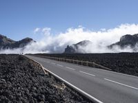 A highway in Tenerife, Spain, winds through a landscape of volcanic lava and towering mountains. The road stretches high into the elevated clouds, offering stunning views of the clear sky. The Armco barriers provide safety on this highland adventure.