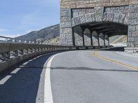 This stock photo depicts a tunnel leading to a highway near mountains in a scenic setting in California, USA. The road's railings point outwards, creating an architectural arch bridge. The tunnel is made of concrete and is part of the highway infrastructure. The clear sky and coastal waters add to the scenic view. The image captures a curve in the highway, and a guard rail can be seen, providing safety for drivers. This photograph represents a section of the famous Pacific Coast Highway, also known as Big Sur, showcasing the stunning landscapes of California's coastline.