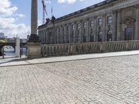 A classic street view in Berlin, Germany, showcasing the city's iconic architecture and cobblestone roads. People are seen walking along the historic buildings. Museum Island stands out amidst the urban landscape.