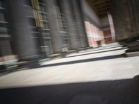 This image captures the vibrant city of Berlin, Germany. The skateboarder moves swiftly through a tunnel between historic buildings on a sunny day. The sunlight illuminates the architectural details, casting shadows and giving a warm glow to the scene. The hardwood flooring and columns add a classic touch to the urban design. This bustling city is known for its rich history and tourist attractions, such as the Altes Museum. Experience the dynamic city life and explore the European charm of Berlin.