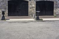 This image showcases a stone building with classic architecture in Hamilton, Ontario, Canada. In the foreground, two black fire hydrants stand on the sidewalk, while a clock tower is visible in the distance. The surrounding area is lush and green, with vegetation and grass. The road surface is made of dirt and gravel, giving a rural feel to the scene. This historic architecture serves as a tourist attraction, reflecting the rich heritage of Hamilton. The image captures a sunny day in the suburb, creating a peaceful and inviting atmosphere.