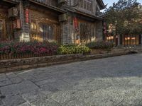 This is an image of an old street in Lijiang, China. The cobblestone road is flanked by buildings with a classic architecture style. Red lanterns hang on the facade of one building, adding a vibrant touch to the scene. The clear sky above contrasts with the vegetation and trees lining the road. This picturesque residential area showcases the historic architecture of the region. The street is quiet, with only a few people walking along the narrow alley. This photo captures the charm and tranquility of Lijiang's old town.