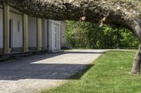 a large trunk in the grass near some buildings and a path that is next to the trees