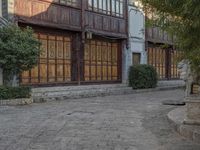 A stunning example of historic architecture in Lijiang, China. This photo showcases a statue in front of a large building with wooden panels on the side walk and large windows on the rear of the house. The cobblestone road adds to the charm of the property, while the surrounding trees and village setting create a picturesque scene. It's the perfect day to explore this old town and stroll down the quaint alleyways and side roads of Lijiang. Discover the allure of classic architecture in this enchanting suburb of Yunnan province, known as Shangri-La.