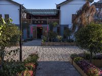 This is an image of a classic oriental house in Lijiang, China. The building showcases the historic architecture of the area, with cobblestone streets and a brick walkway leading to the entrance. The residential property is surrounded by a courtyard garden, with flower beds on either side of the walkway. In the foreground, there are trees and a low wall, adding to the tranquil atmosphere. The clear sky provides a beautiful backdrop to the scene. This photo captures the beauty and charm of a traditional village in China.
