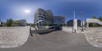 A unique perspective of a modern architecture building in Berlin, Germany. The cobblestone streets and low-rise buildings give a charming and historic feel. The clear sky enhances the beauty of the facade and the surrounding urban vegetation.