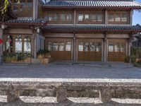 the entrance to a large old chinese home in stone walls and wood doors with a wooden roof