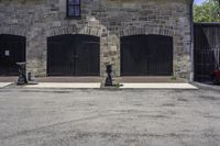 an older stone building with garage doors and two fire hydrants on each side of the driveway