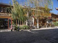 A charming corner restaurant in the historic town of Lijiang, China. Surrounded by classic architecture and lush vegetation, it is a popular tourist attraction in the region. Enjoy a meal under the tree on a clear day in this picturesque old village.