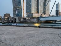 A cityscape of Holland at dawn, showcasing modern architecture and high-rise buildings. The clear sky contrasts with the urban design, while cobblestone roads lead to open spaces. Explore the beauty of urban living in Europe.