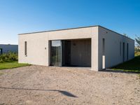 This stock photo showcases a modern residential building with a unique architecture style in Holland. The house is surrounded by lush green grass and trees, creating a beautiful open space. The property features a rectangular structure made from composite materials, with a clear sky as the backdrop. The road surface and gravel pathway lead to the entrance door of the villa. This image perfectly captures the blend of modern design and natural elements in a residential area of Holland, a country known for its innovative architecture and stunning landscapes. The fixture and shading add a touch of elegance to the overall aesthetic of the house.