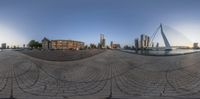 A picturesque view of a bridge across the water in Holland. The brick square with cobbles adds to the charm of this urban scene. The clear sky and the reflection of city lights create a stunning night-time atmosphere.