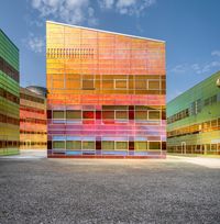 A multicolored high-rise building in Holland's business district. Modern architecture with stacked windows and a rectangular facade. Clear sky illuminates the urban design with open spaces and office buildings.
