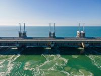 This is an aerial view of a coastal city in Holland, Netherlands. The image showcases the modern architecture and the intricate network of roads and bridges. The city is surrounded by water, with the ocean stretching out towards the horizon. A clear sky adds a vibrant backdrop to the scene. The photograph captures the unique blend of nature and urban infrastructure in this European city. The elevated perspective provides a comprehensive view of the city's skyline, including bridges, piers, and dams. This photo represents the harmonious blend of land and water in Netherlands.