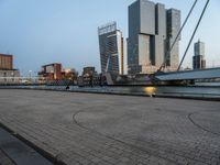 A picturesque view of an urban cityscape in Holland. Modern architecture and high-rise buildings dominate the open spaces. The clear evening sky adds to the beauty. A bicycle stands in front of a bridge, showcasing city life in Europe.
