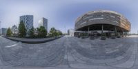 fish eye lens photo of the city and its surroundings in a circular shape with people walking on pavement