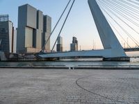A stunning cityscape of Holland at dawn. Modern architecture blends with historic cobblestone streets and canals. Towering high-rise buildings form an impressive urban design. Clear sky adds to the beauty of the European city landscape.