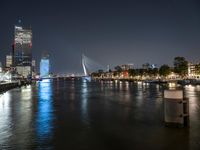 A stunning nighttime cityscape in Holland. The illuminated bridge reflects off the calm waters of the river, surrounded by modern high-rise buildings. The clear sky adds to the enchantment of urban design in Europe.