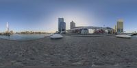 A stunning fish-eye view of a modern cityscape in Holland. The mirror-like image reflects the high-rise buildings and azure sky. The city's architecture and urban design create a picturesque landscape.