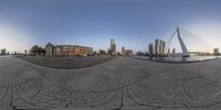 Cityscape of a metropolitan area in Holland, captured with a fisheye lens. Skyscrapers and modern architecture dominate the skyline. Open spaces and water resources create a vibrant urban design.