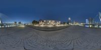 A captivating fish-eye view of a coastal city in Holland at dawn. Modern architecture lines the waterfront, reflecting in the calm water. The cityscape is illuminated by the afterglow of the sunset.