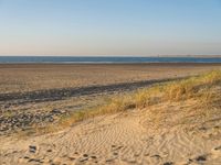 This is an image of the coastal landscape of Holland at dawn. The photo captures the sandy beach with the ocean stretching out to the horizon. The open space is covered with grass and vegetation, blending seamlessly with the sand dunes in the distance. The sky above is clear, allowing the sunlight to illuminate the entire scene. This serene and natural setting represents the beauty of the coastal region of Holland. It showcases the unique landscape and vast open spaces that can be found in this part of Europe.