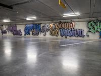 This is an image of a modern architecture parking garage in Holland. The concrete structure is located in a vibrant city, with open spaces and a graffiti wall nearby. The ceiling of the parking deck is adorned with artistic graffiti, adding a touch of urban art to the metropolitan area. The image captures the unique design and aesthetic of the building, showcasing the innovative automotive design of Holland. This photo represents the intersection of art and architecture in a European city.
