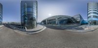 A 360-degree view of a city street in Holland, Netherlands. Modern architecture dominates the business district, with office buildings lining the road. Urban design features include curved and straight roads, open spaces, and a bus stop. A cyclist crosses the street.