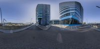 A modern cityscape in Holland, Netherlands. The reflection of the city's architecture can be seen in the middle of the road. Traffic flows across the bridge, surrounded by sleek office buildings. A perfect example of urban design in Europe.