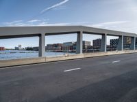 an empty city highway with a bridge and a few buildings in the background on a sunny day