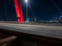 This is an image of a cityscape in Holland, Netherlands at night. The modern architecture is illuminated by street lights and the city comes alive with artificial light. The foreground features an asphalt road surface leading to a bridge. The bridge is a cable-stayed suspension bridge, a unique urban design feature. The image captures the energy and vibrancy of city life in Europe. With its dark background and the glow of electricity, this photo represents the dynamic nature of urban environments.