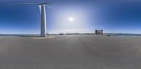 A view of a road intersection in Holland with wind turbines and water in the background. The clear sky and calm water create a serene atmosphere. The symmetrical architecture of the wind turbines adds to the urban design of the landscape.