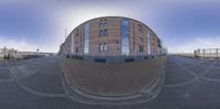a fish eye lens picture of a building by the water with a train in the background