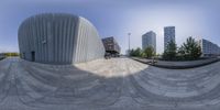 An empty building in Holland with modern architecture and a concrete facade. The clear sky contrasts with the grey urban surroundings. A skateboarder performs a mid-air trick in front of the building, showcasing the vibrant city life.