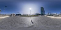 this is a fisheye image of an empty space with buildings in the background and a person skateboarding