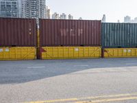 This image showcases the modern architecture and cityscape of Happy Valley, Wan Chai in Hong Kong. The vibrant yellow facade and metal gates of the buildings stand out against the clear sky. The road surface and asphalt provide access to the open spaces and industrial areas of the city. In the background, the harbor and shipping containers represent the urban transport and bustling tourist activities. This photo captures the unique blend of urban and industrial charm of Happy Valley, making it a popular destination in Hong Kong's art district.