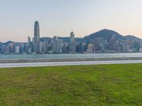 A stunning view of the Hong Kong city skyline at dawn with clear skies. The photo captures the urban landscape with skyscrapers, roads, and a beautiful coastline. The lush greenery and grass surface add to the charm of the cityscape. In the distance, the ocean glistens, creating a captivating contrast against the city's modern architecture. The paver road leads to various urban design elements, making this image perfect for showcasing the urban lifestyle and the beauty of Hong Kong.