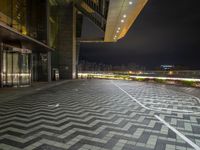 This is an image of a modern urban cityscape in Hong Kong. The black and white square on the brick floor represents an open space in the bustling city. The lights above the square create an artificial light, adding to the city's vibrant atmosphere. The image captures the dark night sky and the silhouette of skyscrapers and office buildings that dominate the skyline. The photo showcases the modern architecture and urban design of Hong Kong's business district. It reflects the energetic and bustling city life that can be experienced in this vibrant metropolis.