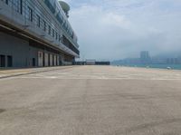 This is an image of an airplane parked at the airport in Hong Kong on a cloudy day. The city skyline and skyscrapers can be seen in the background, giving a glimpse of the urban design and city life of Hong Kong. The jetty and coastal shoreline along with the low clouds create a scenic cityscape. The presence of the ocean and water adds to the beauty of the surroundings. This photo captures the vibrant and modern atmosphere of Hong Kong.