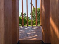 the large wood building has columns on each side, and two windows looking into a garden