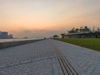 a beautiful, empty sidewalk near a beach during the sunrise as viewed from the water's edge