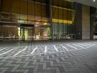 a photo of an open area inside a building at night with sunlight streaming in through the glass windows