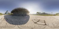 a fish - eye view of a circular brick structure with a person on a bike in the foreground