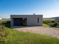 This image captures a modern concrete house in a residential area of Holland, Netherlands. The house stands alone in an open space with a plain grass surface. The clear sky above highlights the modern architecture of the building, showcasing its unique design and clean lines. A parking space is visible on the side of the house, adding to the convenience of the property. This photo represents the combination of natural environment, architecture, and open space that can be found in residential areas of Europe.