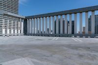 A view of a modern office building in Houston, Texas. The building features a sleek metal facade and a clear sky in the background. The urban cityscape showcases the business district with open spaces and parking decks.
