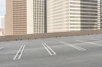 A view of the bustling business district in Houston, Texas. High-rise office buildings and skyscrapers dominate the urban landscape. The concrete surface is lined with parking decks and open spaces. A true metropolitan area.